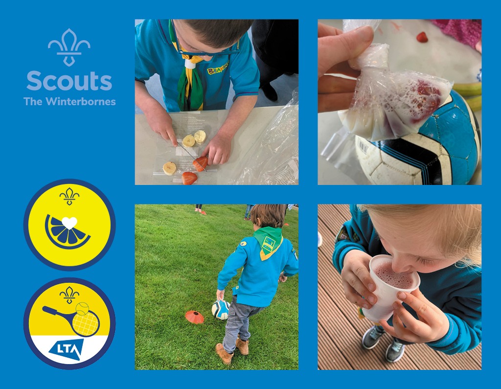 Beavers learnt how to chop fruit safely, we popped them into a sandwich bag with some milk, tied in a knot and placed inside a football. Lots of kicks later.. we all enjoyed a lovely fruity milkshake!