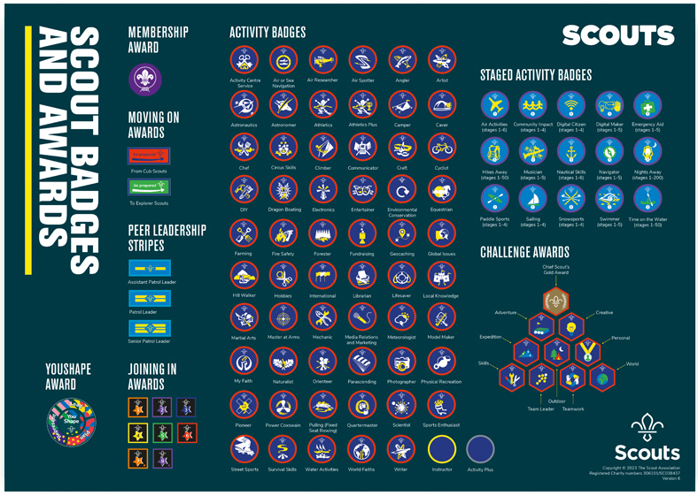 Throughout each section (Beavers, Cubs & Scouts) of Scouting every young person will be earning lots of badges, alongside that the leaders will be making sure they are covering criteria for their Chief Scout Awards, the highest award you can receive in Scouting. In Beavers this is a Bronze, Cubs is Silver and Scouts is Gold. The Gold challenges are; Adventure, World, Creative, Expedition, Outdoor, Skills, Teamwork, Team Leader and Personal. See more info here…